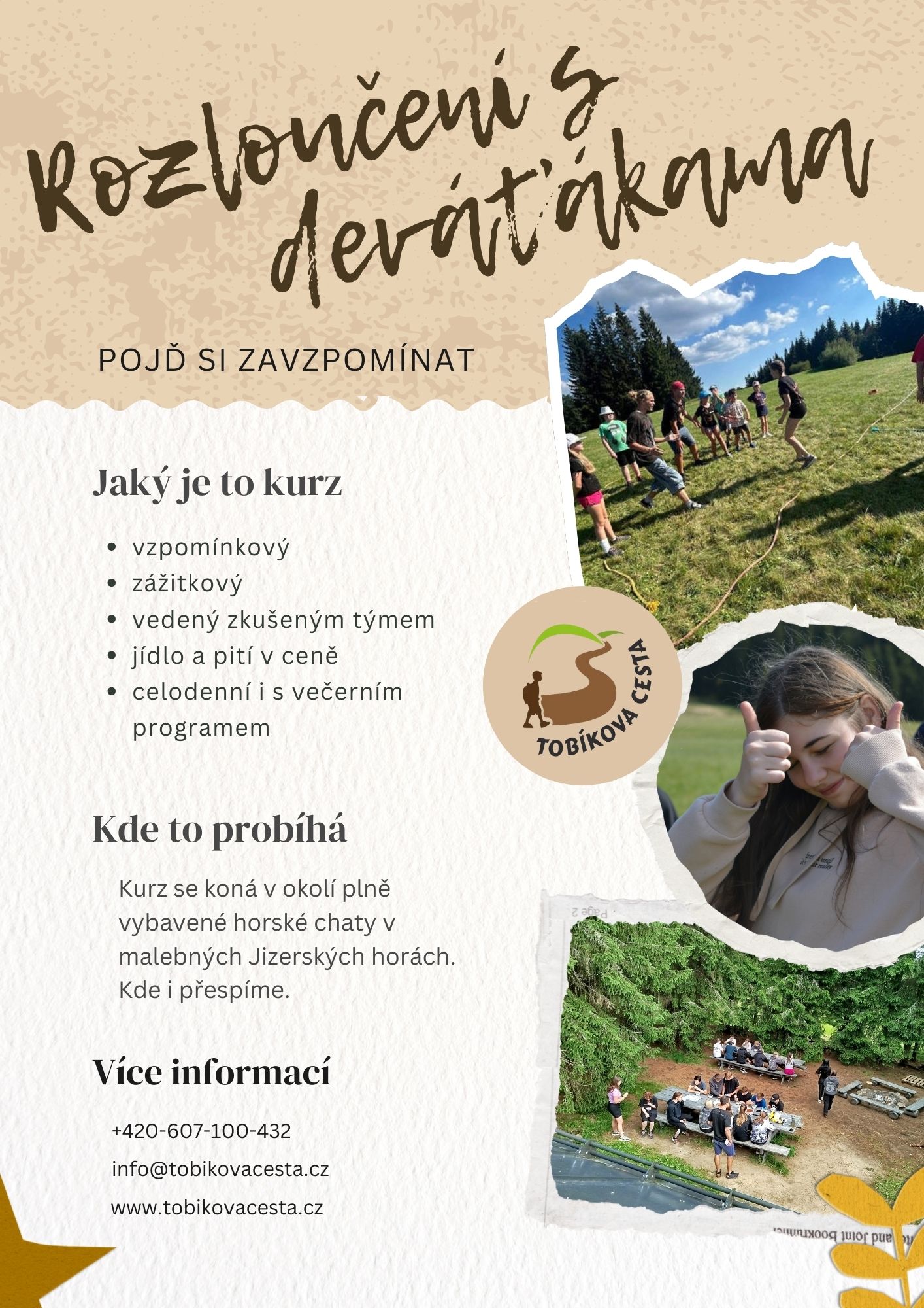Tak přesně o tomhle je náš oblíbený netradiční školní výlet s názvem Rozlučení s deváťákama. Společnými silami se za pomoci dobrodružných a outdoorových aktivit pobavíme a ohlédneme zpět napříč celou základní školou. Vypíchneme nejdůležitější momenty, pobavíme se nad nesmrtelnými hláškami učitelů, poděkujeme jim za trpělivost a projdeme večerním obřadem pasování z žáků na studenty.. Obřadem, který z Tebe udělá středoškoláka a který si budeš pamatovat hodně dlouho. Umíš si představit lepší ukončení základní školy?